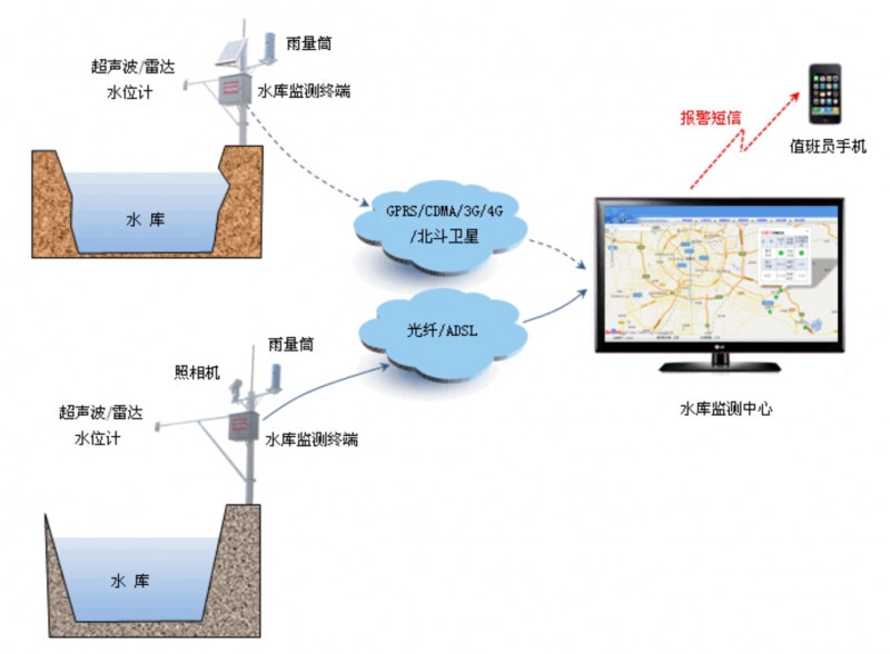水雨情自動監測系統主要實現水情、雨情全過程的遠程自動采集、拍照監視,實時記錄河道、水庫、渠道水位的動態變化過程。系統根據監測水位及警戒水位、汛限水位,時段降雨量、日累計降雨量實現聲音、顏色、短信的防汛排洪預警功能。